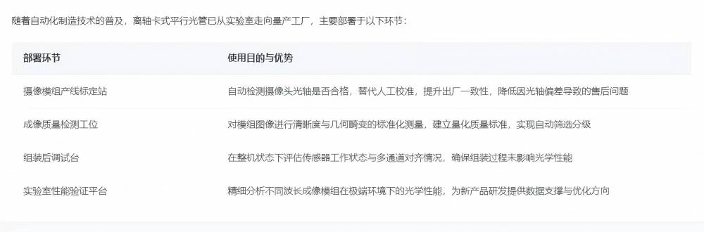 随着智能化技术深入日常生活,家电设备早已不再是简单的功能工具,而成为融合了传感感知、数据处理、自动控制与人机交互的综合智能平台。从智能扫地机器人到全景摄像安防系统,从红外手势操控空调到具备视觉识别能力的智能冰箱,这些产品背后的“看见世界”的能力,越来越依赖于精准、稳定、高质量的光学感知系统。 为了实现这些功能,现代智能家电在制造和调试阶段引入了大量***的光学技术。其中,离轴卡式平行光管作为一种高精度光学调校与测试工具,正在成为保障视觉模组质量、提升出厂一致性、降低调试成本的重要设备。 一、智能家电中的光学感知系统发展趋势在智能家居时代,家电设备的“智能化”已经不再只是联网或语音控制,更重要的是具备“环境理解能力”。这类理解主要依赖于以下感知方式: 可见光摄像系统:如扫地机器人路径识别、安防摄像头人脸识别等 红外成像系统:如热感应调温空调、人体感应照明灯具等 激光扫描模组:如激光导航机器人、距离传感器、空间三维感知等 这些传感器往往组合在一起形成“多通道视觉模组”,构建起对家居环境的三维建模与事件识别能力。这就对光学系统的校准、光轴一致性、成像质量和光束控制提出了极高要求。 面临的主要挑战包括: 不同通道间的光轴偏差影响识别效果; 图像边缘畸变或模糊导致视觉算法失效; 模组批量调试效率低、依赖人工; 高性能需求与低成本制造的矛盾; 在这种背景下,使用一种高稳定性、标准化、结构紧凑的准直光源设备——离轴卡式平行光管,成为解决上述难题的有效手段。 二、应用场景详解:离轴卡式平行光管如何服务智能家电1. 智能扫地机器人导航系统的模组调校 现代扫地机器人普遍集成了视觉导航模组,结合可见光与红外摄像头识别家居边界、障碍物和路径图。 在模组调校阶段,若摄像头光轴未对准、焦点偏移或系统像差较大,将影响路径规划精度,甚至导致机器人“卡死”或盲扫。 离轴卡式平行光管在其中的作用: 提供无穷远目标仿真,用于标定摄像系统对远景物体的响应; 利用高平行度光束对摄像头光轴进行校准; 支持多波段校准,一机调试红外与可见光摄像头; 精度高,***识别算法与路径规划模型的一致性。 2. 智能安防摄像头的成像质量检测 家庭安防系统越来越依赖于高分辨率全景摄像头或AI人脸识别摄像头,其对图像清晰度、边缘畸变控制、夜间红外能力要求极高。 应用需求与问题: 调校焦距与传感器位置,确保成像清晰无模糊; 校验边缘视场图像是否拉伸失真; 红外夜视功能调试需标准化热源仿真。 离轴卡式平行光管的优势体现: 输出高质量准直光,检查视场内各点成像一致性; 支持红外光源模拟,检测夜间红外系统的成像质量; 非遮挡式设计,避免传统光管因中心遮挡导致的光斑异常; 支持批量模组出厂检测与工位调试流程集成。 3. 激光测距/空间建模设备的激光扩束与校准 智能冰箱、空调、智能音箱等越来越多地集成ToF测距模组或结构光深度相机,用于识别人脸、感知距离、适配交互空间。这些设备中普遍使用激光作为主动光源,需进行激光束方向控制和扩束调试。 离轴卡式平行光管在此场景下的作用: 激光扩束:通过反射系统降低激光发散角,提高测距精度; 光束对准:精调发射端与接收端的光轴方向,提升反射匹配度; 全自动标定:集成于测试线,实现标准化参数比对与自动校正; 安全性:膜层选择与镜面材质可控制红外激光反射风险。 4. 手势识别与环境交互模组调试 部分智能家电产品,如空调、灯具或厨电,配备了红外/可见光手势识别系统,实现“无接触控制”。这类系统需要高稳定度的光轴匹配与图像清晰度。 应用痛点: 手势系统在不同距离识别能力变化大; 成像模组小巧但需***调焦; 多模态系统需光轴共线性佳。 离轴卡式平行光管作用: 准直光源校验手势感知范围响应曲线; 模拟手势动作成像,分析识别系统鲁棒性; 在近红外光谱下提供标准图样或目标模拟,完成性能验证。 三、智能家电产业链中的部署方式与使用优势随着自动化制造技术的普及,离轴卡式平行光管的使用也从实验室走向了量产工厂。在家电制造企业中,其常被部署于以下环节: