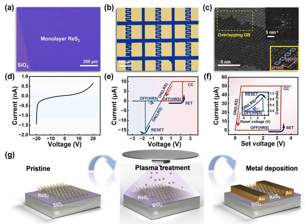 图1 两端ReS2忆阻器阵列的性能及等离子体处理工艺。(a)SiO2/Si衬底上连续ReS2单层的光学图像。(b)在ReS2单层上制备的横向忆阻器阵列的光学图像。(c)包含重叠晶界的原始ReS2单层的扫描透射电子显微镜图像。右上角插图为对应的选区电子衍射图案,右下角插图为ReS2晶格的放大图像,图中标注了两个主要晶轴。(d)、(e)、(f)分别展示了两端ReS2器件阵列的三种电学行为情况:非忆阻行为、双极性忆阻行为、单极性忆阻行为。(g)等离子体处理工艺的示意图。