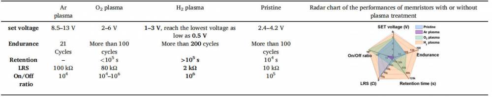 表1 不同气体类型等离子体处理的忆阻器性能对比