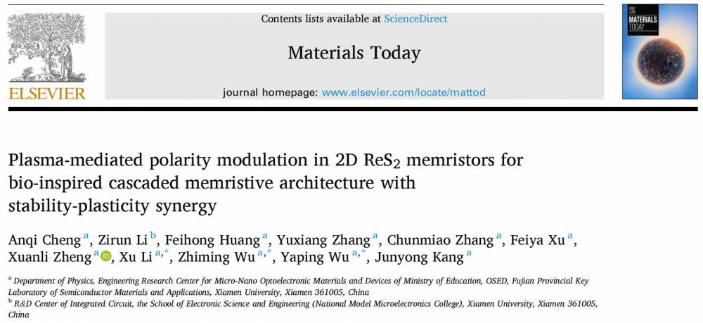 厦门大学物理系的吴雅苹教授课题组在忆阻器领域研究中取得***进展,该研究成果以“Plasma-mediated polarity modulation in 2D ReS2 memristors for bio-inspired cascaded memristive architecture with stability-plasticity synergy”为题发表在《Materials Today》上。