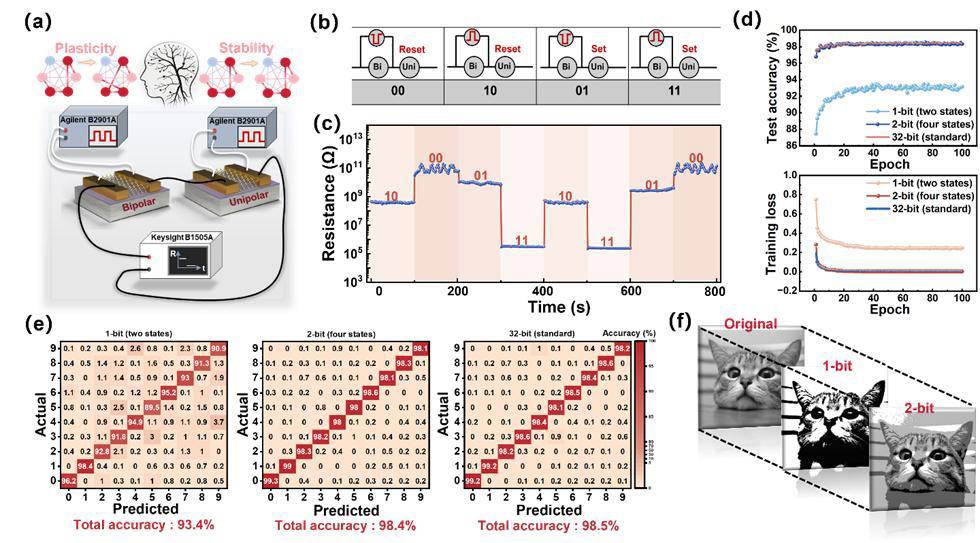 借鉴大脑海马体-新皮层协作模式,我们构建了单极-双极忆阻器级联架构,前端双极器件实现突触权重动态调整(高可塑性),后端单极器件实现信息稳定存储(高稳定性),可实现4种电阻状态(2位编码)。在量化神经网络中,2位级联架构对MNIST手写数据集的识别准确率达98.4%,仅比32位基准系统低 0.1%,但存储需求压缩了16倍,成功在计算保真度与硬件效率间实现平衡,为类脑计算芯片开发提供了可行方案。