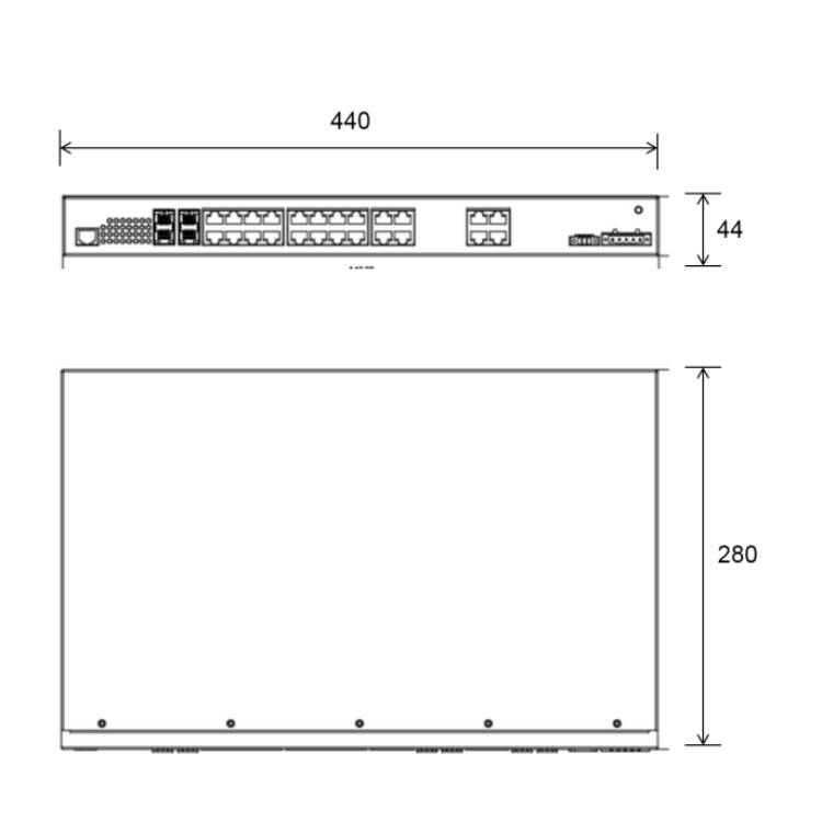 订货型号 型号 规格 DS-3T3528 ***管准三层工业交换机,24千兆电+4千兆SFP光,1个CLI控制口,支持工业环网保护协议,工作温度-40~85°C,双工业业级AC电源(90~260V),19寸机架式安装。 DS-3T3528 海康威视28口二层可网管以太网工业交换机 外形尺寸(单位:mm):