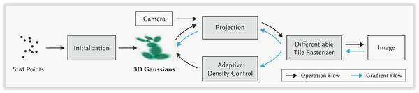 2、3DGS整体框架 3D Gaussian Splatting(3DGS)的整体框架是一个端到端的管道,其核心思想是将整个三维场景表示为数百万个可学习的3D高斯球。这些高斯球作为场景的基本表示单元,每个都拥有各自的属性,包括3D空间中的位置、描述其形状与方向的协方差矩阵、以及视角相关的球谐函数所表示的颜色和不透明度。
