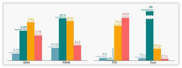 在保持高保真度场景重建的同时,3DGS技术还具备***渲染速度,这得益于其采用的基于图像分块的渲染方式。通过与其他三维重建方法对比可见,3DGS在视觉效果上能够媲美NeRF-360,而训练时间却大幅缩短至几十分钟甚至几分钟。相较于NeRF-360动辄数十小时的训练成本,这无疑是一项重要突破。 能够在与Instant-NGP相当的训练时长内,达到接近NeRF-360的重建质量,正是3DGS技术的关键优势所在,也是其在三维重建领域持续受到关注的重要原因。