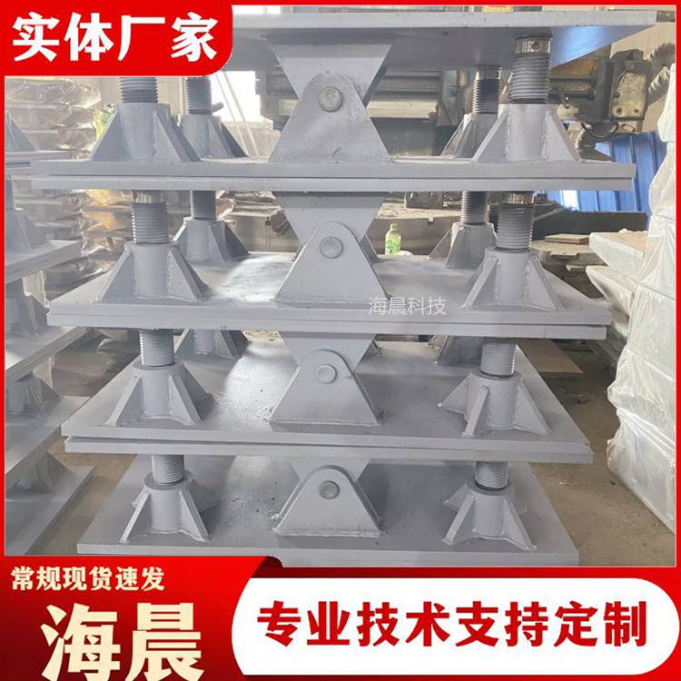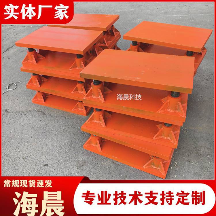 前期准备现场清理与找平:清理预制 T 梁台座表面的杂物、混凝土残渣,确保台座顶面平整,平整度误差≤2mm。若台座表面有局部凹陷,需用高强度水泥砂浆修补并养护至强度达标,通常≥C30。参数核对与标记:查阅设计图纸,明确 T 梁梁底预埋钢板的设计纵坡值、调坡器的安装位置,通常沿梁长方向每 2-3m 设 1 组,每组 2 个,对称布置于梁肋下方。在台座顶面用墨线弹出调坡器的安装中心线,并用记号笔标注每组调坡器的 “基准端” 和 “调节端”。工具与材料准备:准备好水平仪、全站仪或水准仪、扭矩扳手、扳手、卷尺、记号笔、防锈润滑剂等工具,以及调坡器、高强度螺栓、定位钢板等材料。调坡器需检查外观无变形、丝杆无锈蚀。桥梁调坡器厂家 调坡器装置 高度200 300 定制各种尺寸规格 海晨支撑底座:与临时支座或***支座连接,提供稳定基础。调节单元:液压千斤顶、螺旋升降机或楔形调高块,实现高度调节。锁定装置:调整完成后通过螺栓、插销或自锁机构固定位置。监测系统:集成倾角传感器、压力传感器,实时反馈坡度和荷载数据。¥ 210/套 | 点击购买