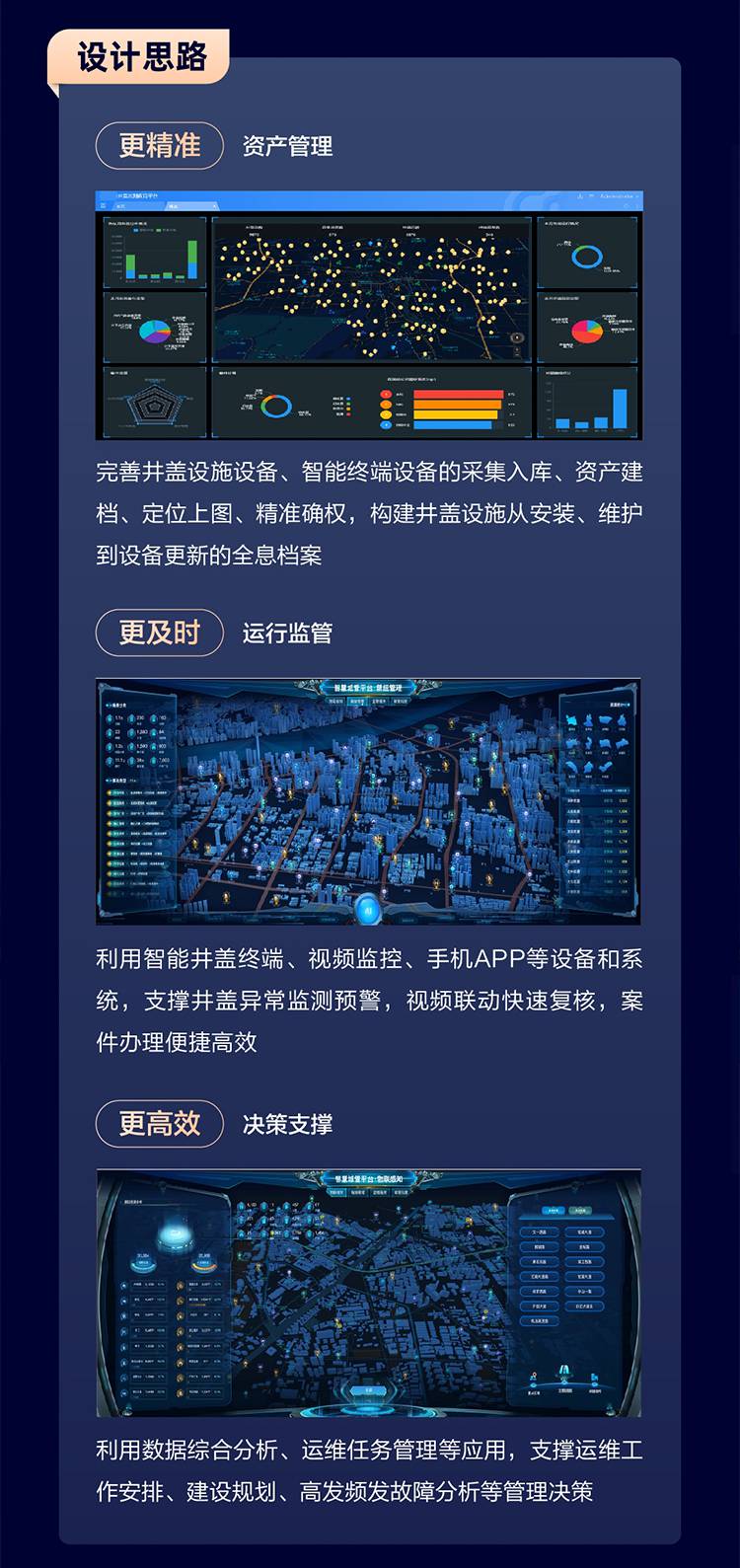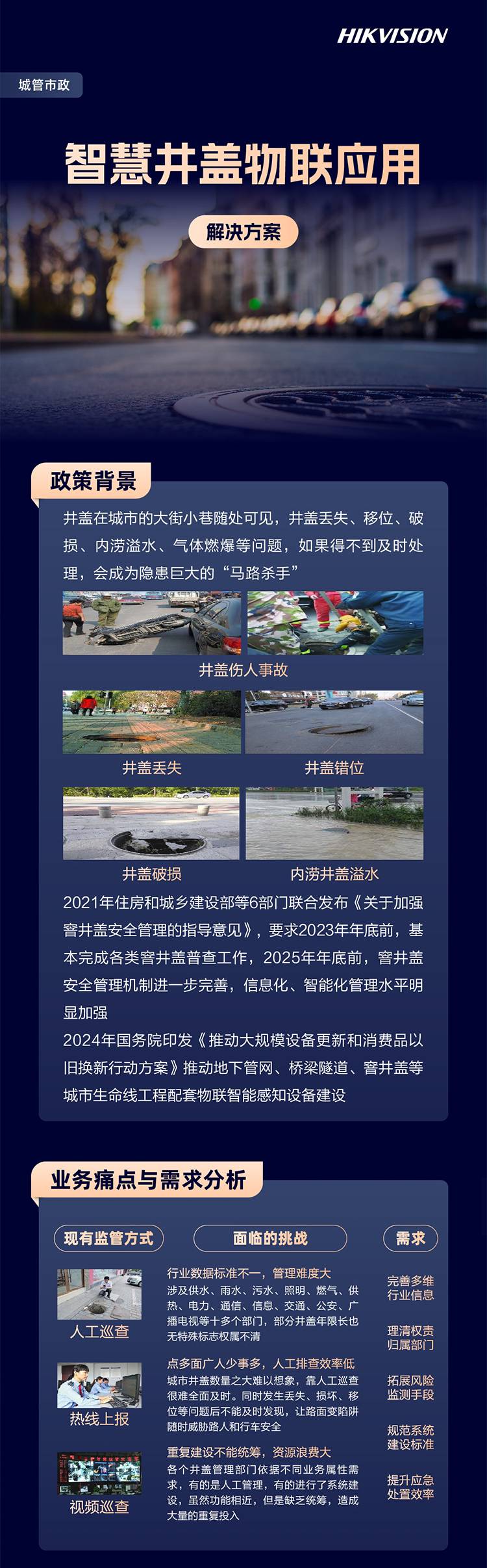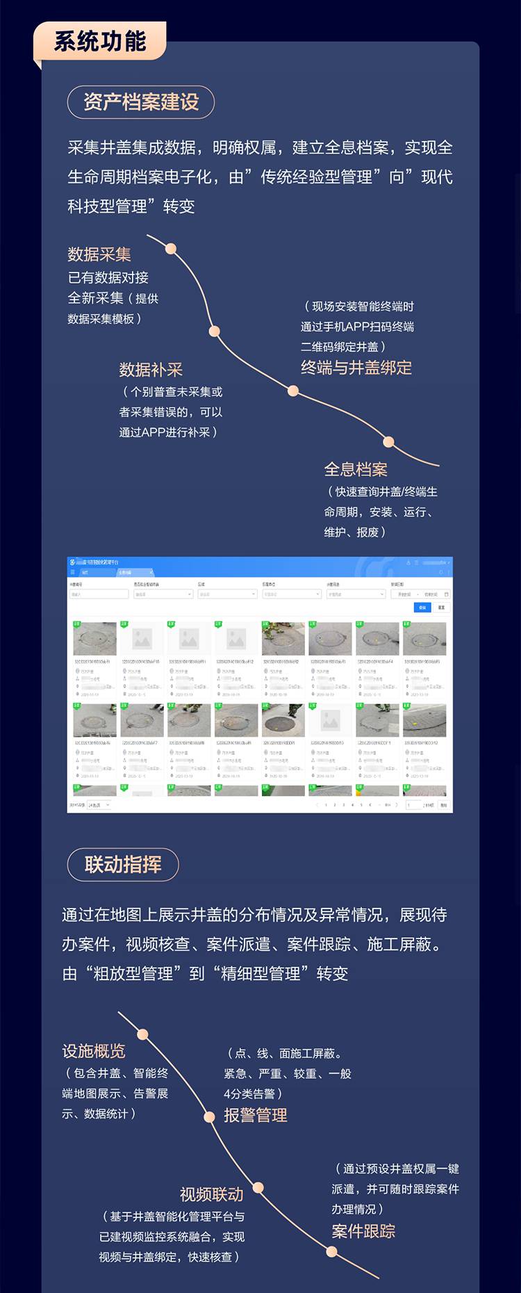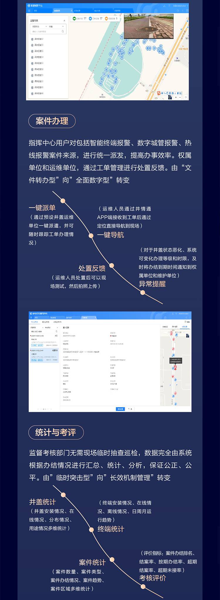 智慧井盖物联应用 解决方案 政策背景 井盖在城市的大街小巷随处可见,并盖丢失、移位、破损、内涝溢水、气体燃爆等问题,如果得不到及时处理,会成为隐患巨大的“马路杀手 井盖伤人事故 井盖丢失 井盖错位 井盖破损 内涝井盖溢水 2021年住房和城乡建设部等6部门联合发布《关于加强窨井盖安全管理的指导意见》,要求2023年年底前,基本完成各类窨井盖普查工作,2025年年底前,井盖安全管理机制进一步完善,信息化、智能化管理水平明显加强2024年***印发《推动大规模设备更新和消费品以旧换新行动方案》推动地下管网、桥梁隧道、窨井盖等城市生命线工程配套物联智能感知设备建设 业务痛点与需求分析 现有监管方式 面临的挑战 需求 人工巡查 热线上报 视频巡查 行业数据标准不一,管理难度大涉及供水、雨水、污水、照明、燃气、供热、电力、通信、信息、交通、公安、广播电视等十多个部门,部分井盖年限长也无特殊标志权属不清 点多面广人少事多,人工排查效率低城市井盖数量之大难以想象,靠人工巡查很难全面及时。同时发生丢失、损坏、移位等问题后不能及时发现,让路面变陷阱随时威胁路人和行车安全 资源浪费大重复建设不能统筹,各个井盖管理部门依据不同业务属性需求,有的是人工管理,有的进行了系统建设,虽然功能相近,但是缺乏统筹,造成大量的重复投入 完善多鯬维行业信息 理清权责归属部门 拓展风险监测手段 规范系统建设标准 提升应急处置效率资产管理 丰 完善井盖设施设备、智能终端设备的采集入库、资产建档、定位上图、精准确权,构建井盖设施从安装、维护到设备更新的全息档案 更及时运行监管 利用智能井盖终端、视频监控、手机APP等设备和系统,支撑井盖异常监测预警,视频联动快速复核,案件办理便捷高效 更高效决策支撑 利用数据综合分析、运维任务管理等应用,支撑运维工作安排、建设规划、高发频发故障分析等管理决策系统功能 资产档案建设 采集井盖集成数据,明确权属,建立全息档案,实现全生命周期档案电子化,由”传统经验型管理”向”现代科囿趾鍵洺孕技型管理”转变 数据采集 已有数据对接全新采集(提供 数据采集模板 ) 数据补采(个别普查未采集或者采集错误的,可以通过APP进行补采) (现场安装智能终端时通过手机APP扫码终端 厍二维码绑定井盖)终端与井盖绑定 全息档案(快速查询井盖/终端生命周期,安装、运行、维护、报废) 0面 联动指挥 通过在地图上展示井盖的分布情况及异常情况,展现待办案件,视频核查、案件派遣、案件跟踪、施工屏蔽。由“粗放型管理”到“精细型管理”转变 设施概览(包含井盖、智能终端地图展示、告警展示、数据统计) (点、线、面施工屏蔽。紧急、严重、较重、一般 4分类告警)报警管理 视频联动 (基于井盖智能化管理平台与已建视频监控系统融合,实现 视频与井盖绑定,快速核查) (通过预设井盖权属一键派遣,并可随时跟踪案件 办理情况) 案件跟踪案件办理 指挥中心用户对包括智能终端报警、数字城管报警、热线报警案件来源,进行统一派发,提高办事效率。权属单位和运维单位,通过工单管理进行处置反馈。由“文件转办型”向”全面数字型”转变 一键派单(运维人员通过井情通(通过预设井盖运维APP端接收到工单后通过单位一键派遣,并可定位直接导航到现场 )随时跟踪工单办理情一键导航!况 (对于井盖状态恶化、系统可变化办理等级和时限,及处置反馈时将办结到期时间通知到权属单位和维护单位)异吊提醒 运维人员处置后可以现 场测试,然后拍照上传) (社+用不信公市商平? ToImG5 か工E AEL011 柗南㖨制 ❤ 師無蹽進 馎λ榼÷¥楼礻 0 缸 丘湖北道51口17 雰敌 e173 史置发清 中黑宝F 迎湖头源兴 C 出师编景 t 记南 S. 6- 29州区1 兕记跎閒熬窜突螞墐具犷瞟祛ɪ撟淥撼噲xỬ匙鱅徒豉鴕羴分 4井面区计 6241513 5网公 路Ж万CM*DUZ 8R1 N有 统计与考评 监督考核部门无需现场临时抽查巡检,数据完全由系统根据办结情况进行汇总、统计、分析,***公正、公平。由”临时突击型”向”长效机制管理”转变 井盖统计(井盖安装情况、在线情况、分布情况、用途情况多维统计) (终端安装情况、在线情 况、离线情况、日周月运 行趋势)终端统计 案件统计 (案件数量、案件类型、 案件办结情况、案件趋势、 案件区域多维统计) (评价指标:案件办结排名、结案率、按期办结率、超期结案率、超期未接率)考核评价 数据分析 从基础设施分布、i故障频发类型、故障频发路段、故障频发井盖材质、故障频发井盖使用年限、权属单位处置效率排名等多维度,多方面帮忙用户快速分析城市井盖异常情况,为统筹规划提供数据决策支撑 典型案例 江苏某市窨井盖智能化管理系统建设项目(36000余套)山东某市积水点治理检查井防盗智能设备项目(12000余套 |