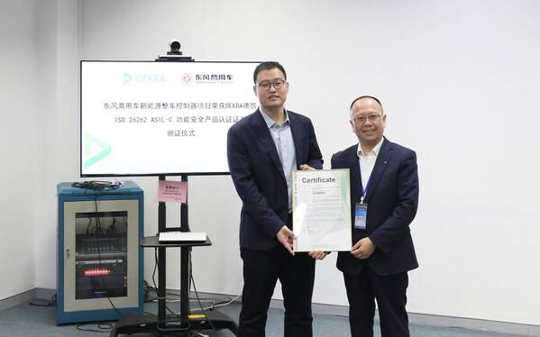 武汉2025年11月10日 /美通社/ -- 近日,东风商用车有限公司新能源整车控制器项目成功通过*** 26262:2018 ASIL-C功能安全认证,并获得第三方检验检测认证机构DEKRA德凯颁发的功能安全认证证书。此次认证是DEKRA德凯为东风商用车完成的***个ASIL-C级别产品认证项目,标志着双方合作的重要里程碑,充分展现了东风商用车在新能源核心电控领域的技术实力和体系能力。 颁证仪式在东风商用车技术中心隆重举行。东风商用车副总经理吴怀主、DEKRA德凯中国规划发展副总裁周旋、DEKRA德凯功能安全总经理李明勋等双方代表共同出席见证。