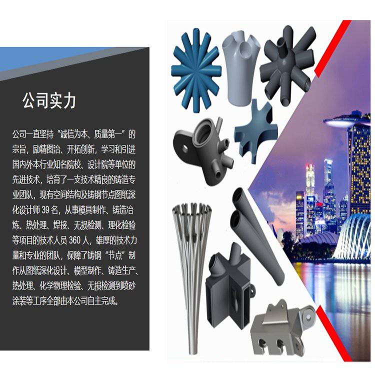 铸钢节点:现代大跨度建筑的“钢铁关节” 在当代宏伟的建筑景观中,无论是体育场馆的飘逸屋盖、交通枢纽的恢弘穹顶,还是异形雕塑的流畅曲线,其背后往往隐藏着一种至关重要的构件——铸钢节点。它被誉为现代空间结构体系的“钢铁关节”,是连接各类杆件、传递复杂内力的核心枢纽,以其***的性能解决了传统钢结构节点难以逾越的难题。 一、 铸钢节点是什么? 简单来说,铸钢节点是通过“铸造”这一古老而又现代的工艺制造出的钢结构连接件。与传统的通过焊接或螺栓将钢板、型钢拼装而成的节点不同,铸钢节点是将在高温下熔化的钢水浇注到预先制作好的精密砂型模具中,一次成型冷却后,再经过热处理、机械加工等工序得到的整体构件。 其核心特征在于 “整体性” 和 “可塑性”。 1. 整体性:铸钢节点是一个完整的、无焊缝的整体结构。它避免了传统节点中大量集中焊缝带来的残余应力、热影响区以及潜在的焊接缺陷,使得内力传递更加流畅、应力分布更加均匀,***提高了节点的疲劳强度和结构安全度。 2. 可塑性:铸造工艺几乎可以实现任何复杂的三维空间形态。无论是需要连接三根、五根还是十几根来自不同方向、不同角度的杆件,设计师都可以根据***的力学模型和建筑造型要求,“量身定制”出形态***的节点。它可以是光滑流畅的相贯线形式,也可以是形态各异的多支管节点,***满足了现代建筑对自由形态的追求。