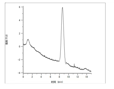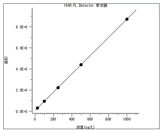3.检测结果 采用Pribolab MDS-3000柱后衍生仪及草甘膦衍生试剂包,对草甘膦系列标准溶液(浓度:25、100、250、500、1000 μg/L)进行分析,并绘制标准曲线。结果表明,该曲线在浓度范围内线性关系良好,线性相关系数为1.0000。 1. 25 μg/L草甘膦色谱图