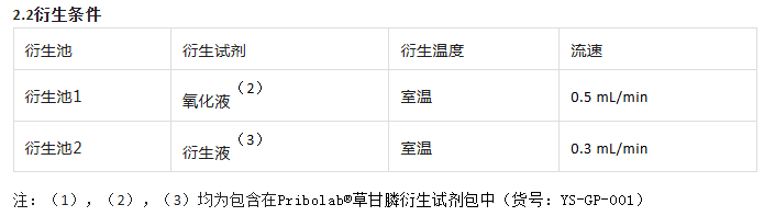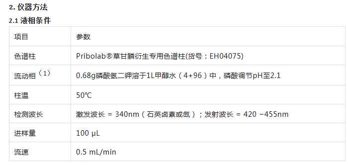 1.检测原理 采用阴离子或阳离子交换色谱法对草甘膦及氨甲基膦酸进行分离;经柱后衍生化处理:先以次氯酸盐溶液将草甘膦氧化为氨基乙酸,再使氨基乙酸与邻苯二甲醛(OPA)和2 -巯基乙醇发生反应,生成具有荧光基团的衍生物,最终采用荧光检测器进行检测。