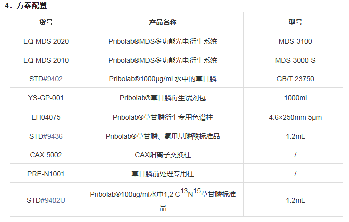 目前常用检测方法包括气质联用法、液质联用法及高效液相色谱法,此类方法均依赖衍生化步骤方可完成检测。青岛普瑞邦生物工程有限公司依据相关检测标准,特推出“柱后衍生-高效液相色谱法” 专属解决方案:通过 Pribolab MDS-3000 柱后衍生系统与草甘膦专用检测试剂包搭配高效液相色谱仪,无需额外复杂处理,即可完成草甘膦及氨甲基膦酸的检测。