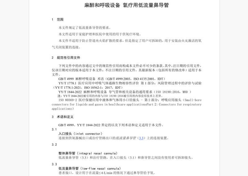 关键技术变化 1 调整范围描述与术语定义,更精准界定氧疗用低流量鼻导管的适用场景。 2 新增通用要求章节,强化产品全生命周期质量管控基础。 3 整合原标准中长度、外观、连接、物理性能等内容,纳入统一的 “设计要求” 章节,优化标准结构。 4 删除原标准中化学性能与生物性能相关条款,聚焦核心物理性能与使用安全性。 5 调整制造商提供信息的要求,增强产品使用与追溯的规范性。 采用 GB/T 4999、YY/T 1778.1 等国内标准替代***引用,适配我国技术条件。 *** 23368:2022标准为低流量鼻氧管(流量≤6L/min)建立了标准化框架,重点规范了与R2呼吸小孔连接器的兼容性要求,适用于家庭护理和医院环境。以下是具体测试要点: 核心测试设备· 低流鼻导管测试仪:通过体积-重量双校准模式(误差≤±2%)和恒定水压差(1000±5mm)模拟人体环境,检测流量精度 。 . 密封性泄漏测试仪:采用压力衰减法(精度±0.1%FS),在0.2-1kPa压力下检测泄漏(衰减值≤0.05kPa为合格) 。