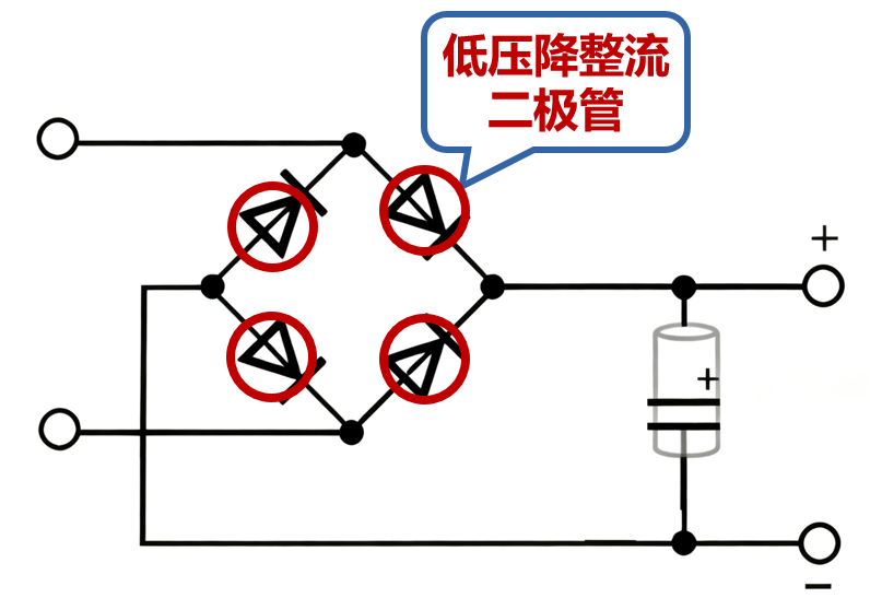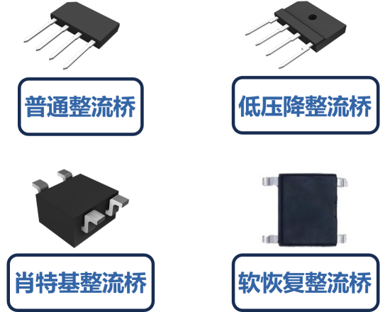 它是利用二极管的单向导电性,把交流电变换成直流电。 2. 低压降整流桥 低压降整流桥,即LOW VF整流桥,是由四颗低压降整流二极管作桥式连接,有四个引出脚。两颗二极管负极的连接点是全桥直流输出端的“正极”,两颗二极管正极的连接点是全桥直流输出端的“负极”,外用绝缘塑封而成。  特点: