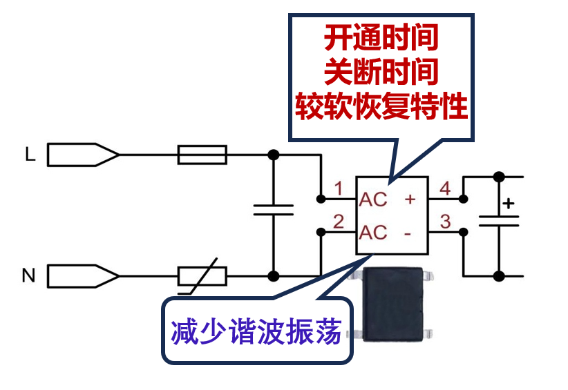 肖特基整流桥具有***的压降与更快的开关速度,在高频、低电压、大电流整流电路中有***的温度表现与更好的效率提升。比如台湾虹扬的肖特基整流桥S-B-24S,压降可以做到0.55V,比低压降整流桥还低。 4. 软恢复整流桥它是通过优化二极管Ta/Tb(开通时间/关断时间)较软的恢复特性,大幅减少谐波振荡的发生,从而减少或者减小桥堆周边EMI抑制器件的使用或者使用规格,例如X电容,共模电感,差模电感等。  特点: