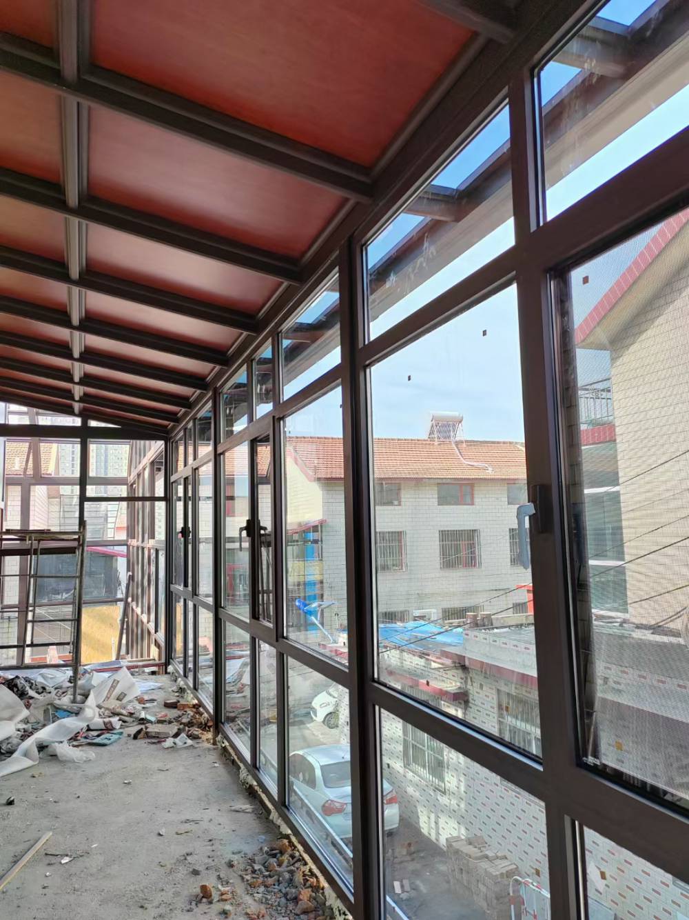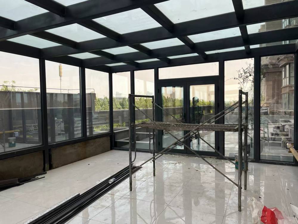 这是一种成品组装的屋顶隔热板安装,自重轻,具有保温隔热防水功能,顶面需要安装德高瓦防晒,耐高温及高空坠物,轻体结构,也是目前洋房别墅封封露台使用最多的一种,价格适中。 玻璃顶阳光房是一种休闲晾衣房,遮风挡雨,采光透亮,优点是造价便宜,缺点是夏天热冬天冷。不宜住人。