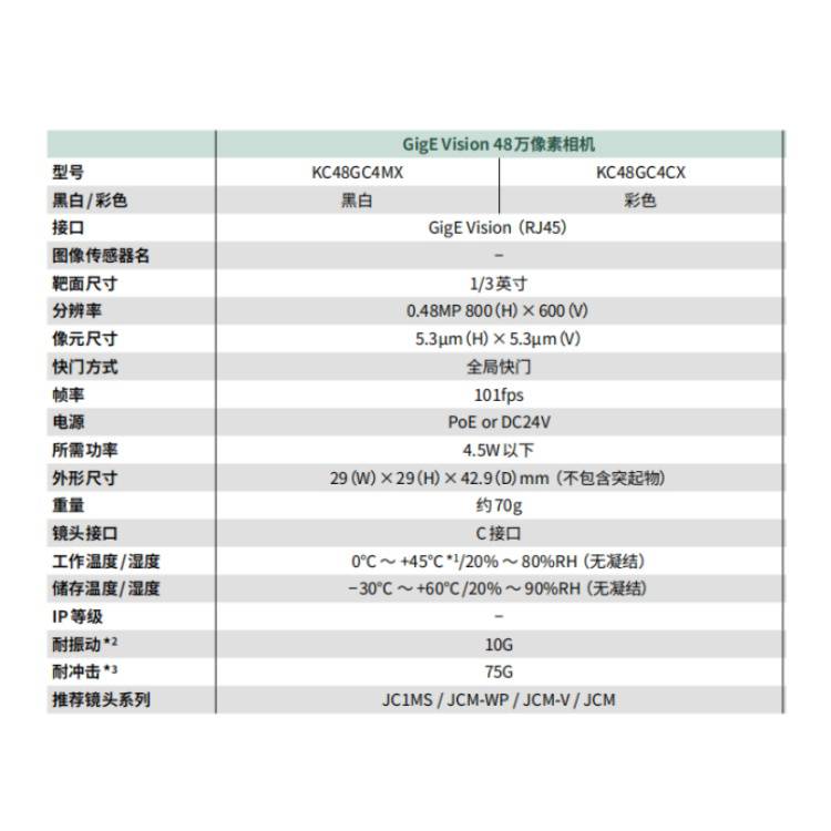 KC48GC4MX KOWA 48万1/3英寸全局千兆网口工业相机 原装日本科瓦相机 黑白/彩色可选 全局快门101fps GigE Vision 耐振动和耐冲击 应对恶劣环境 分辨率800(H)×600(V)像元5.3µm(H)×5.3µm(V)供电 PoE or DC24V 镜头接口C接口 重量约70g KC48GC4CX